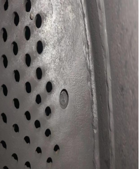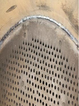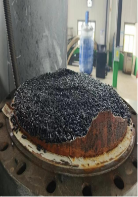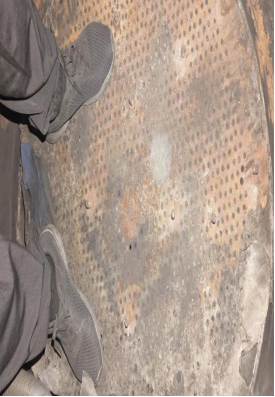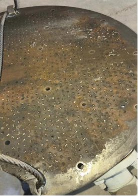 由于设备A塔吸附剂泄漏严重,虽然内部桶壁比较光滑无锈迹,锈蚀较少,但吸附剂粉化严重。另加高层挡板已经完全处于报废状态。底部筛板上的螺丝已经几乎全部断裂,而且筛网破损严重,椰垫已经完全处于堵死状态,另A塔底部有一圈裂缝。