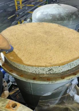 活性碳罐打开法兰盖后加高挡圈已经破损严重,内部罐壁锈蚀严重,因人员无法进入只能清理罐壁锈蚀物,底部铺三层不锈钢筛网,倒入活性碳至罐口,装好加高挡圈再倒入适量活性碳加不锈钢筛网后铺椰垫再铺一层不锈钢筛网,盖好法兰盖,上紧螺丝,活性碳罐维护完成。