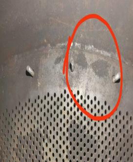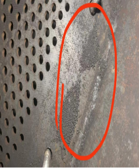 上图是中均压管道由于管道上包裹了2层不同规格的筛网,里层为40目的筛网,外层为20目筛网,由于外层网孔比较大,分子筛可以轻易通过网孔而进入里层筛网,由于筛网只包裹了一圈,分子筛会通过筛网的接头出通过出气孔而漏到吸附塔的外面,从而造成分子筛的松动。