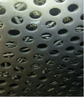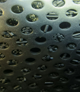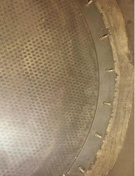 上图是顶部出气部位的筛网,由于使用的也是和底部一样的筛网铺垫顺序,也已经有明显的分子筛通过筛网的网孔进入板孔,但由于上筛网为两层孔板压紧结构,故分子筛是无法穿透筛网而漏出吸附塔外面的。