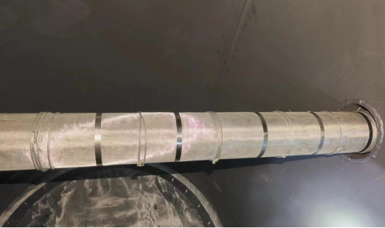 3.将中均压管道取出,重新包裹上5-6圈40目不锈钢筛网,并间隔10厘米左右用抱箍或者铅丝固定后安装好。