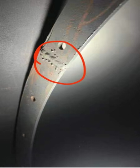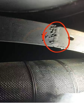 上图是底部筛网的压圈,清理过程中发现压圈的焊接点未打磨,由于凸起部位是与筛网接触,螺丝紧固后会造成凸起边缘会留下间隙,分子筛会在压力的作用下挤到筛板下面,从而造成粉化。