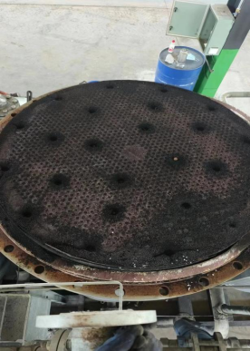 由于设备B塔处于严重生锈,塔上部吸附剂已严重结块,内部桶壁及底部筛板被吸附剂严重锈蚀,吸附剂有严重粉化状态,基本无法正常生产氮气,底部筛板上的螺丝全部锈蚀部分有断裂,筛板孔洞基本锈蚀堵死,而且筛网锈蚀破损严重,椰垫已经完全处于堵死状态,但加高层挡板状态完好。