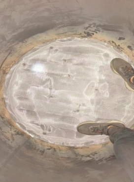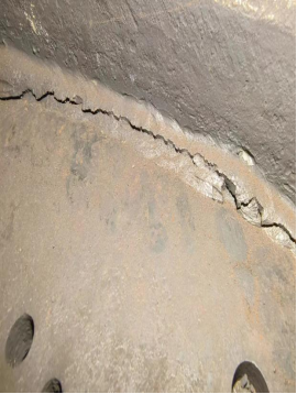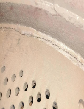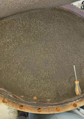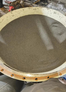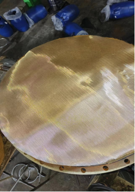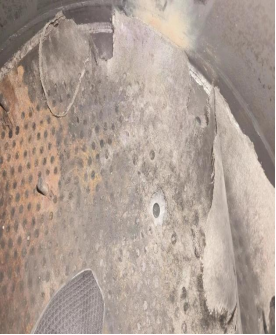 由于设备A塔吸附剂泄漏严重,虽然内部桶壁比较光滑无锈迹,锈蚀较少,但吸附剂粉化严重。另加高层挡板已经完全处于报废状态。底部筛板上的螺丝已经几乎全部断裂,而且筛网破损严重,椰垫已经完全处于堵死状态,另A塔底部有一圈裂缝。