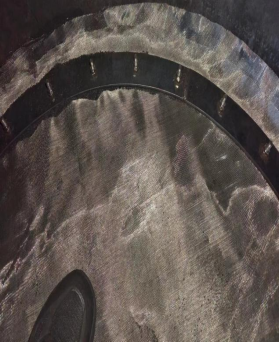 上图是顶部出气部位的筛网,由于使用的也是和底部一样的筛网铺垫顺序,也已经有明显的分子筛通过筛网的网孔进入板孔,但由于上筛网为两层孔板压紧结构,故分子筛是无法穿透筛网而漏出吸附塔外面的。