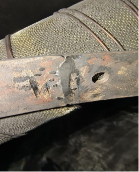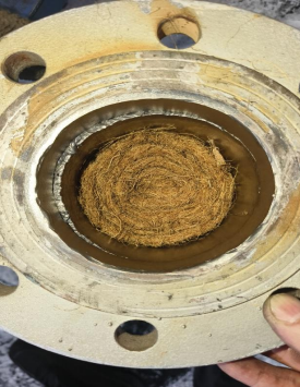 上图是底部筛网的压圈,清理过程中发现压圈的焊接点未打磨,由于凸起部位是与筛网接触,螺丝紧固后会造成凸起边缘会留下间隙,分子筛会在压力的作用下挤到筛板下面,从而造成粉化。