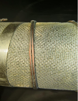 上图是中均压管道由于管道上包裹了2层不同规格的筛网,里层为40目的筛网,外层为20目筛网,由于外层网孔比较大,分子筛可以轻易通过网孔而进入里层筛网,由于筛网只包裹了一圈,分子筛会通过筛网的接头出通过出气孔而漏到吸附塔的外面,从而造成分子筛的松动。